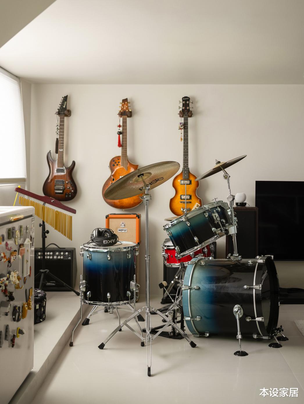 阁楼除了靠墙藏书,不规则的天窗下定制储物柜,另一边刚好摆放男主人的乐器,空闲之余,一家人就愉快开启“演唱会”模式,母女俩就是特邀嘉宾了。