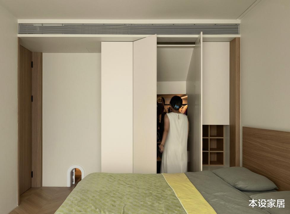 玄关面积不大,入户门的左边做一组经典的三段式储物柜,满足一家人进出门鞋物的收纳需求,并将通往2楼的黑色钢板楼梯下方作为宠物的空间,让它们每天在小窝里迎接主人们的归来。