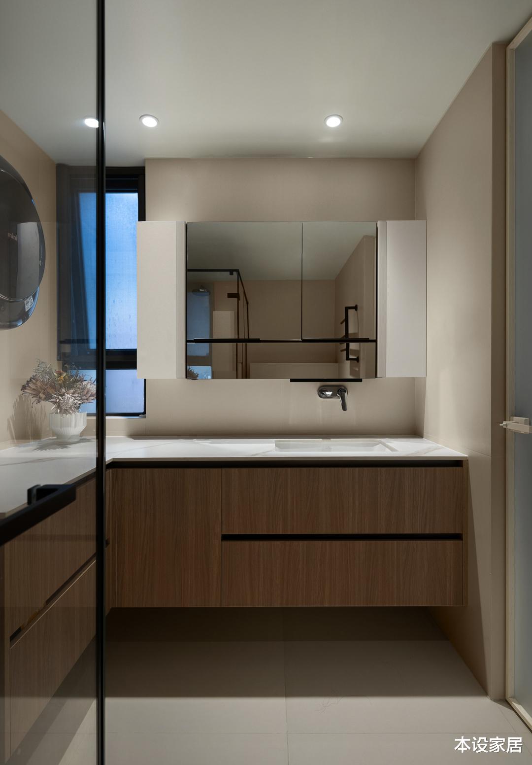 1楼和2楼都有卫生间,镜面柜增加收纳空间,也有延伸视觉空间的效果,而底部留空的洗漱柜,则清洁更方便。嵌入式的黑色龙头,搭配超白玻璃和极细的金属边框,看起来更整洁、更精致。