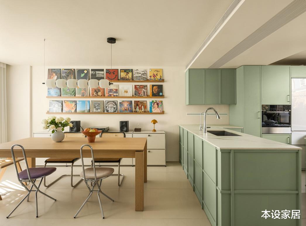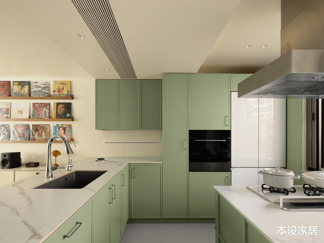 厨房选用清新的粉绿色橱柜,与温润的原木色和干净的白色搭配的相得益彰。