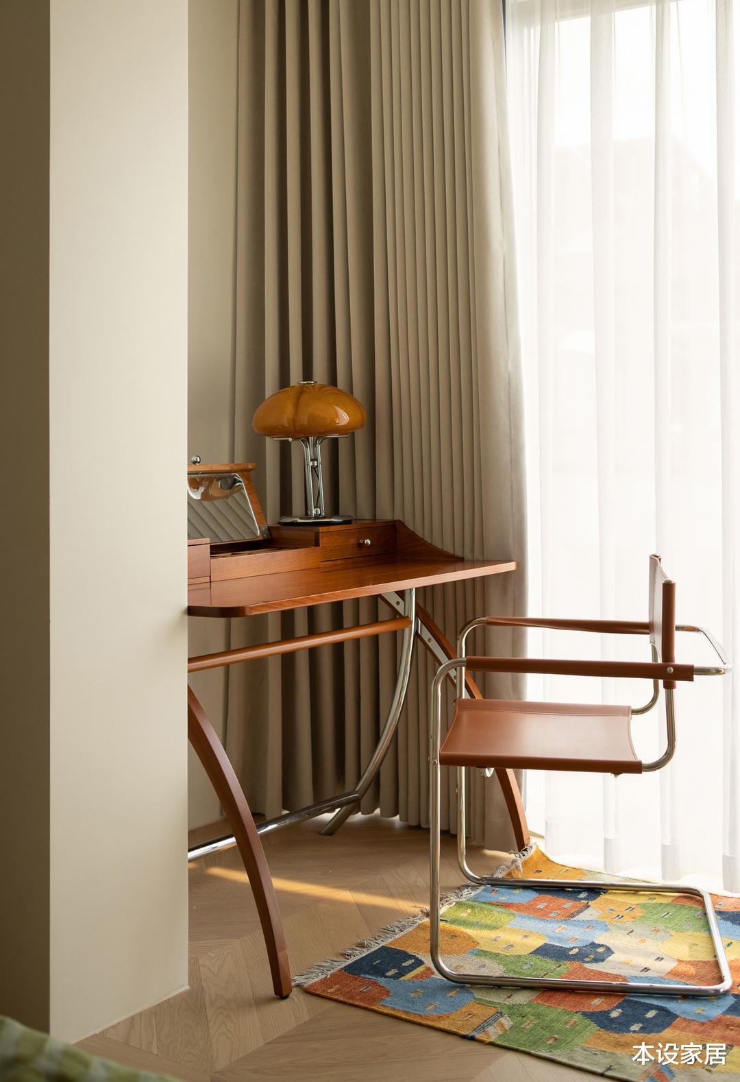 女主人的梳妆台布置在阳台,同系列的桌椅,极简而优美的弧度,让优雅与稳固并存,搭配同色的小台灯,产生一种和谐的美感。