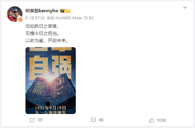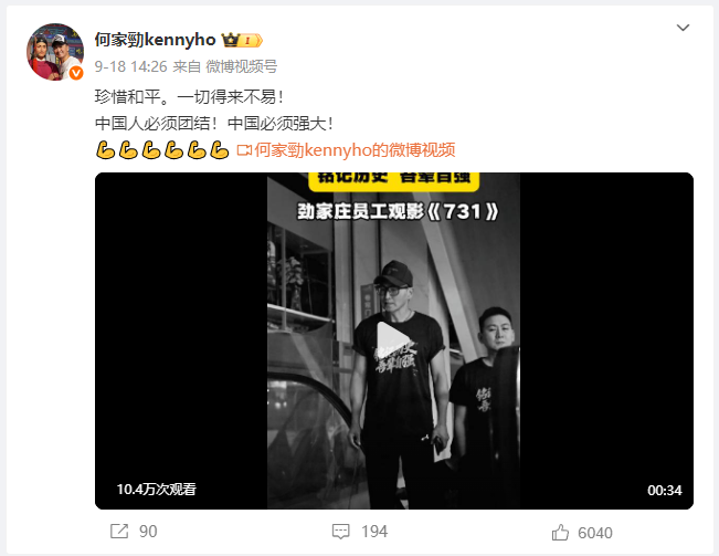“珍惜和平。一切得来不易!中国人必须团结!中国必须强大!”何家劲的配文真挚动人。