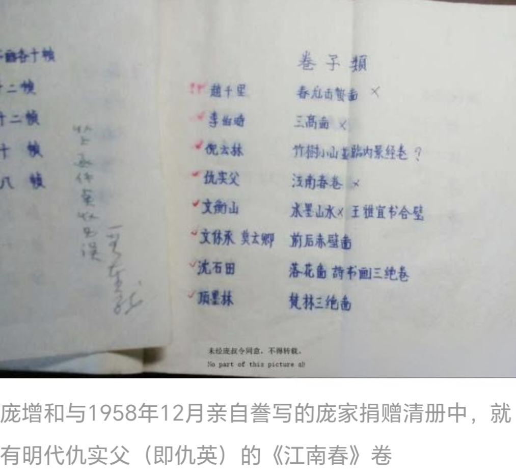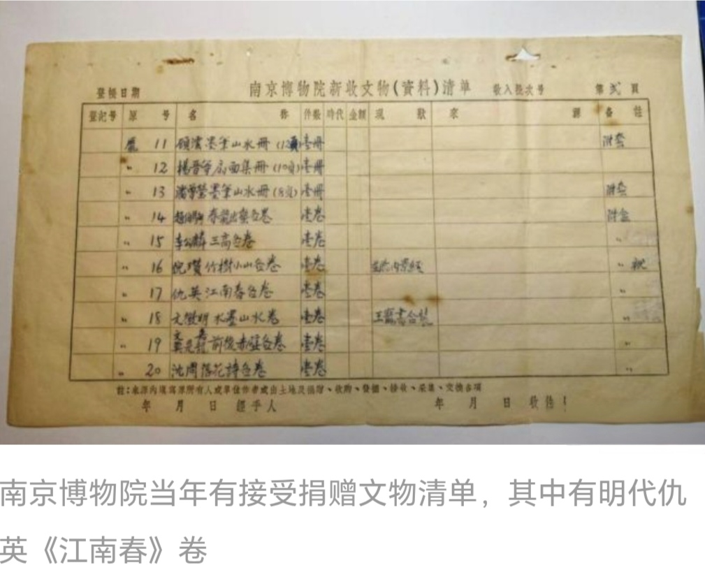 结果没等到查验那天,今年5月她就在北京一家拍卖公司的春拍图录上看到了震惊的一幕,明代仇英《江南春》图卷赫然在列,这正是当年捐赠清单里的那件。