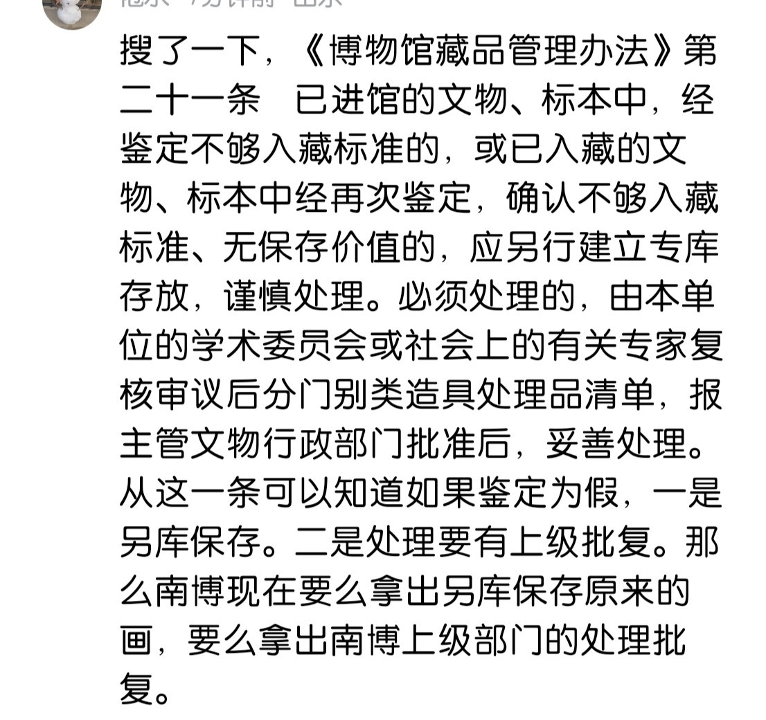退一万步讲,就算真是赝品,按照《博物馆藏品管理办法》第21条规定,不够入藏标准的文物必须另库保存谨慎处理,真要处理得有上级文物部门批复。