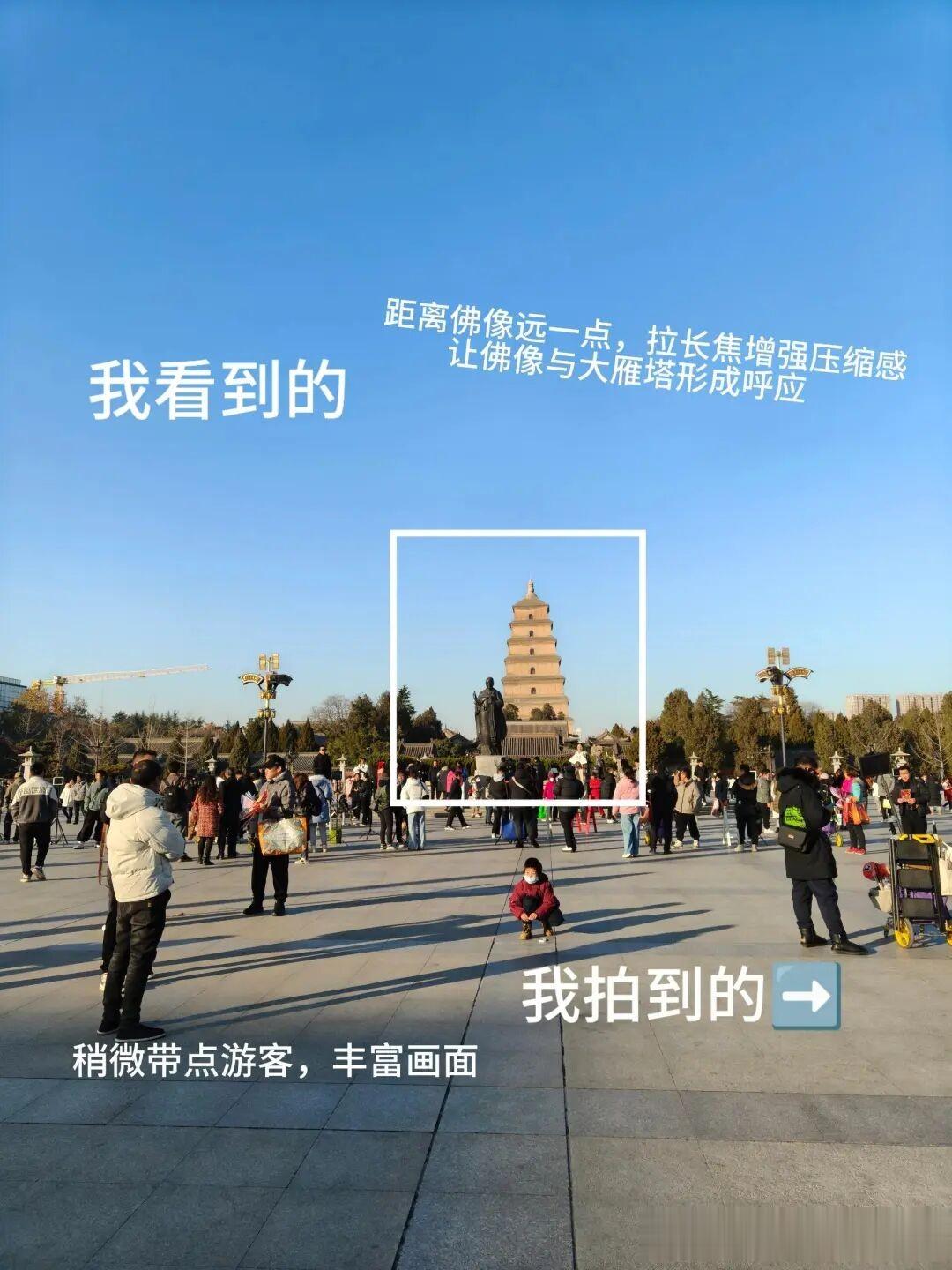 很多人拍景点觉得离得越近拍的越好,这样就容易出现人挤人的画面。有的时候可以离景点远一点,使用长焦镜头拍摄,压缩空间感。