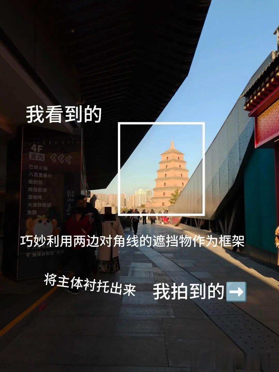 所以,我们有时候不一定非要一窝蜂的靠近景点去拍,可以试试在远处用长焦镜头拍。另外就是要多观察周围,有没有可以用作框架的物体,有没有可以用作引导线的物体...