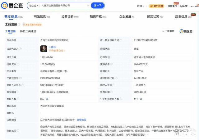 爱企查App显示,大连万达集团股份有限公司成立于1992年9月,法定代表人为王健林,注册资本10亿元人民币,经营范围包括货物进出口、技术进出口、国内一般贸易等。