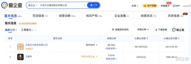 股东信息显示,该公司由大连合兴投资有限公司、王健林共同持股。
