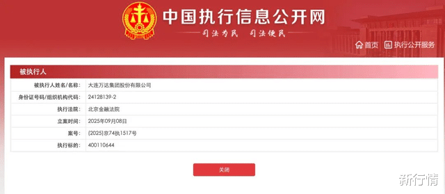 近日,中国执行信息公开网显示,大连万达集团股份有限公司新增一则被执行人信息,执行标的4亿余元,执行法院为北京金融法院。