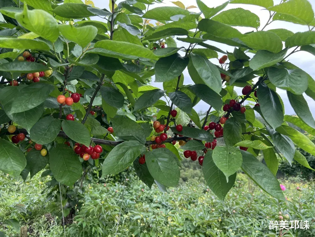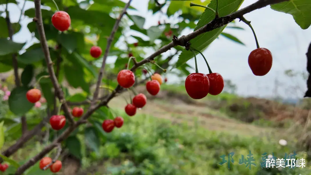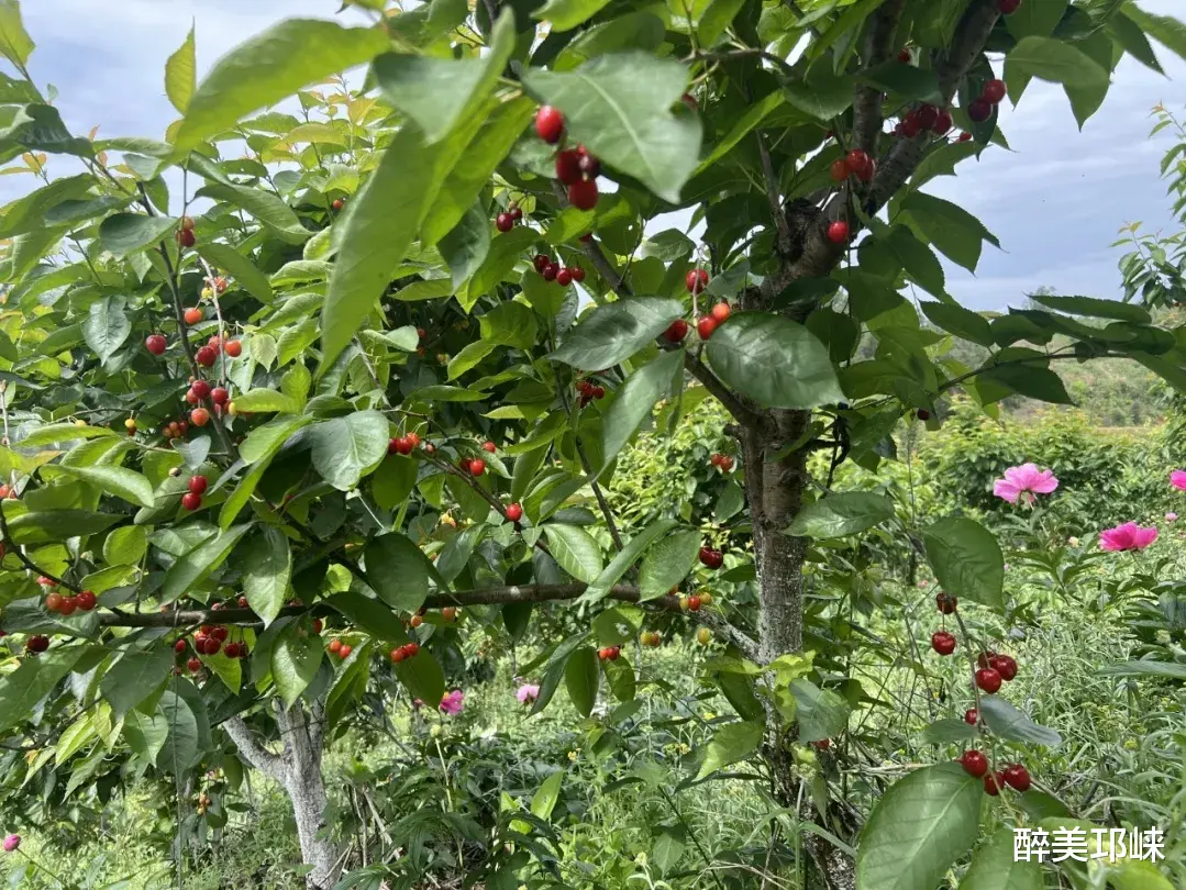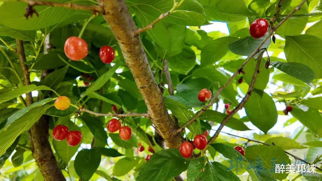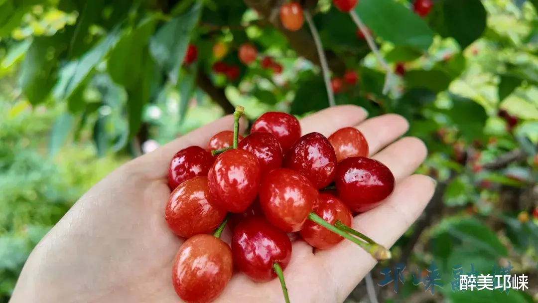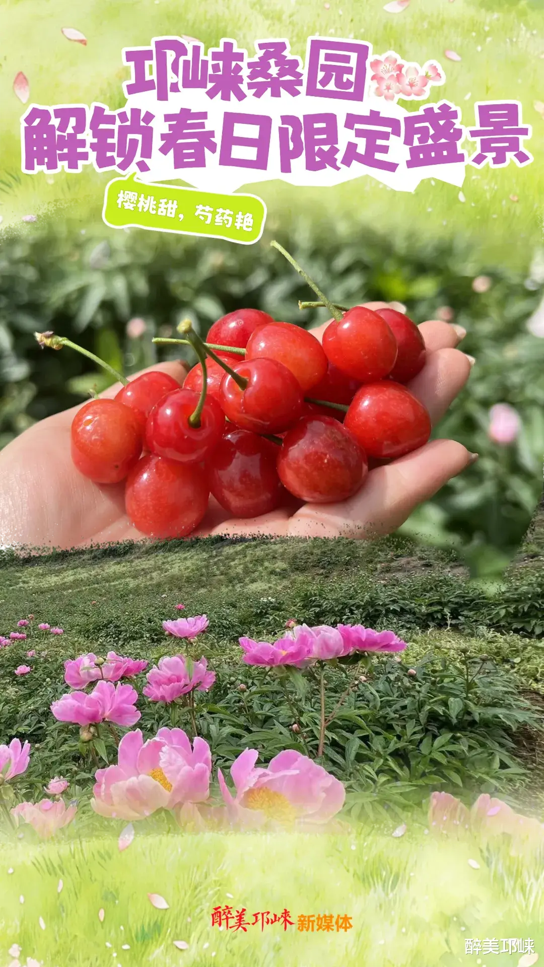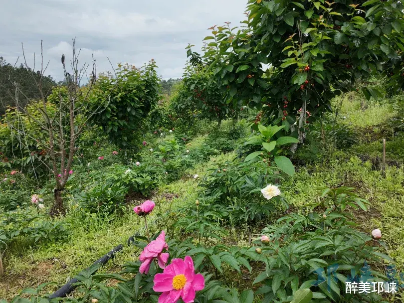 园区内红白相间的芍药花缀满枝头、肆意绽放,层层叠叠的花瓣沾着晨露,随风轻舞;不远处的樱桃林里,一颗颗红亮饱满的果实挂满枝头。