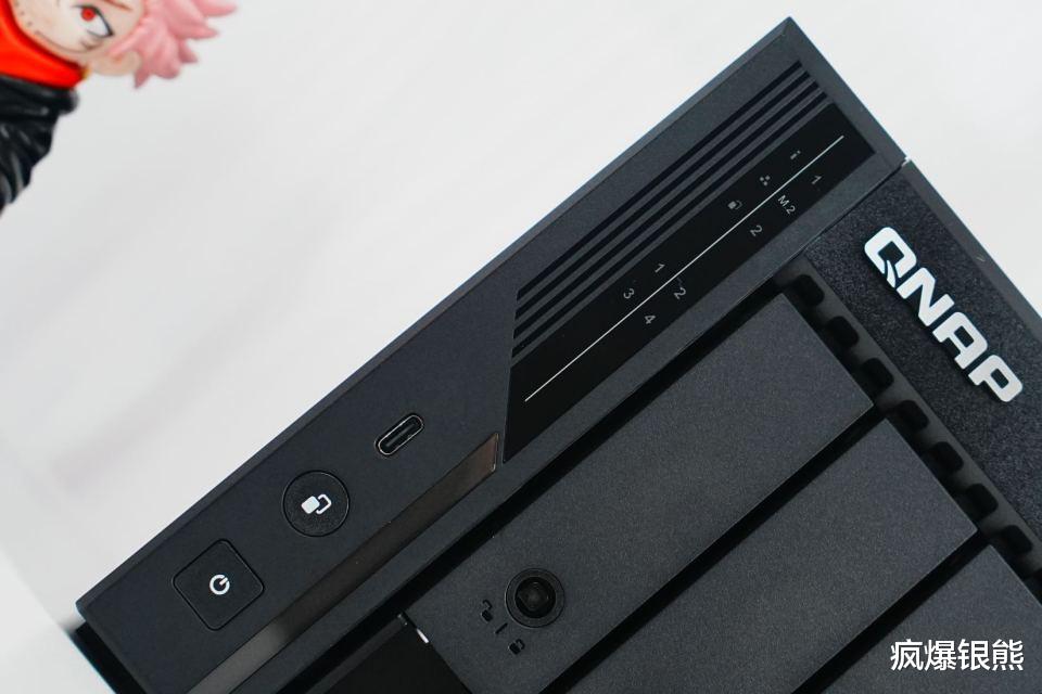 硬盘位设计在正前方,每个硬盘架都配备了硬盘锁,家里有小朋友的我表示必须好评。除了四个盘位外,正面左侧还有方便拷贝数据的一键复制和开关机两个按键。另外按键上方还有一个type-c数据接口,最高支持10gbps的速度传输。右侧最上方细长条的镜面上设计有丰富的状态指示灯,方便用户随时查看NAS状态。