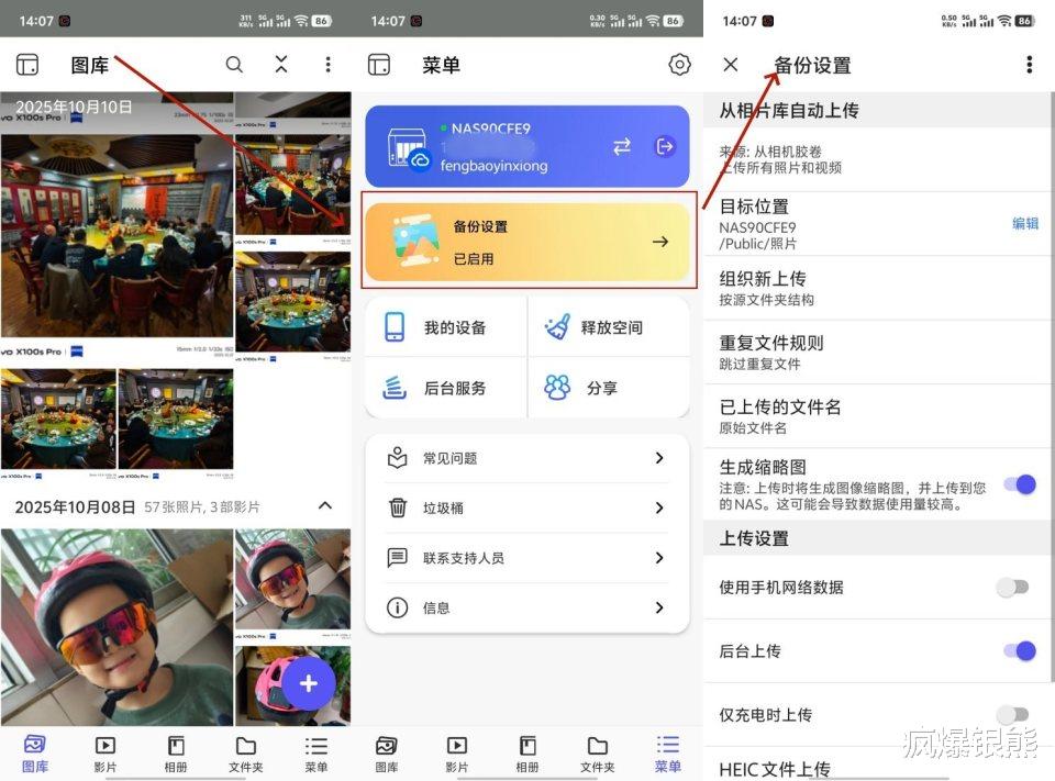 手机端功能和NAS端保持一致,同时其还支持自动备份上传功能,对于经常拍照录视频的小伙伴而言,这个功能真心好用,只要手机和NAS在同一局域网,打开软件后手机中的所有照片和视频都能自动上传到NAS里,128G的苹果手机再也不用担心存储空间不够了。