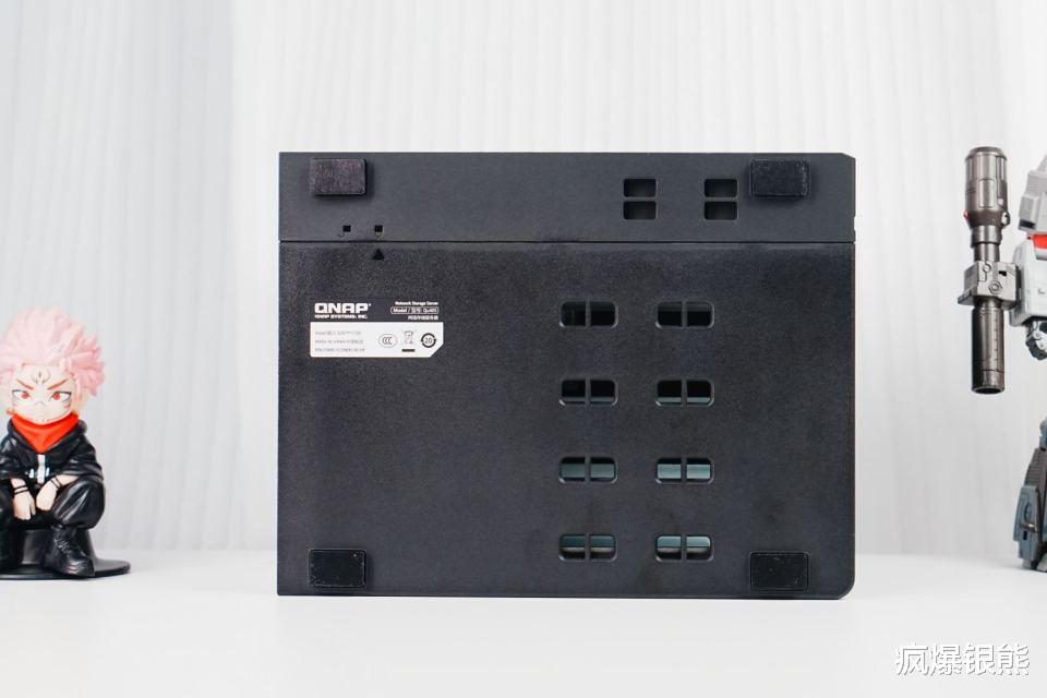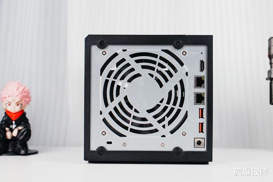 除了正面的一个接口,威联通Qu405的其他接口均被设计在了背面的右侧,自上到下依次为RESET孔、HDMI2.1、双2.5G网口、双USB-A口、DC电源口,其中HDMI 2.1可以稳定输出4K60Hz视频。背面除了接口外,最醒目的应该就是中间硕大的散热风扇了,这里建议厂家附赠一个磁吸防尘网,后期清灰方便一些。