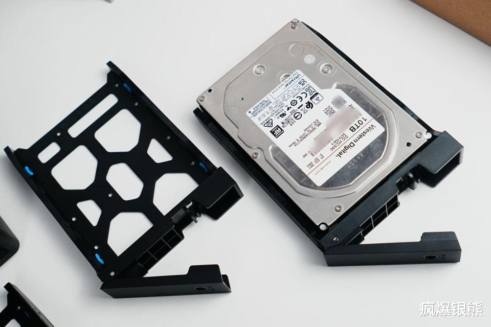 硬盘架设计上,Qu405保持了威联通经典风格,安装3.5英寸硬盘时无需螺丝即可快速固定。