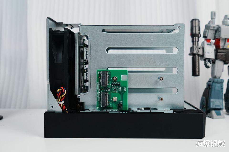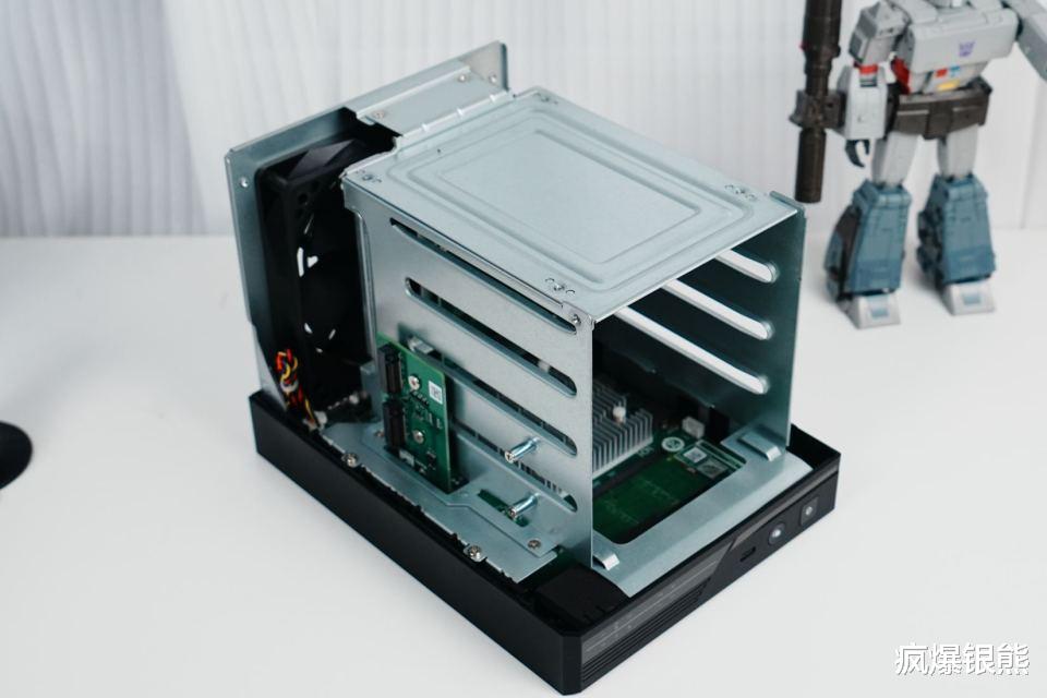 威联通Qu405这款NAS除了正面的四个盘位外,其还拥有两个SSD固态硬盘安装位。在安装SSD上需要拆除外壳,当然拆除方式也非常简单。打开后能看到Qu405的整个金属框架。威联通的产品,不论NAS还是交换机,硬件设计都是挺不错的。