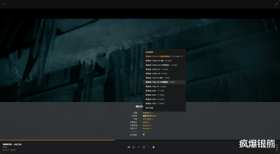 而且Plex自带的播放器功能也很全,其除了可以将视频转换成多种分辨率输出给PC、手机、平板、电视等设备外,也可以切换音频、设置调节字幕等。