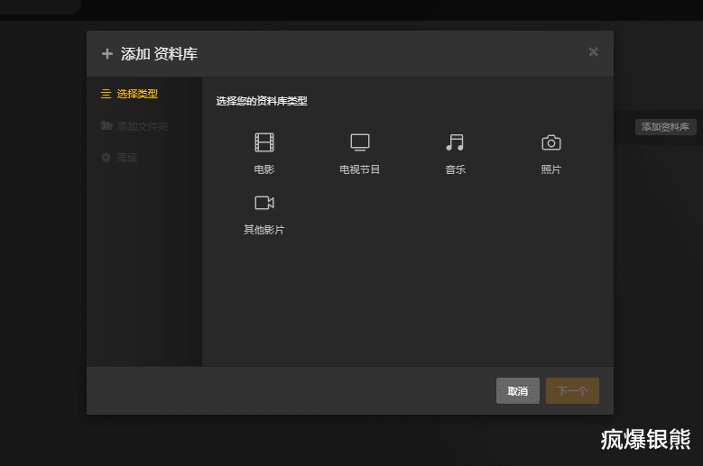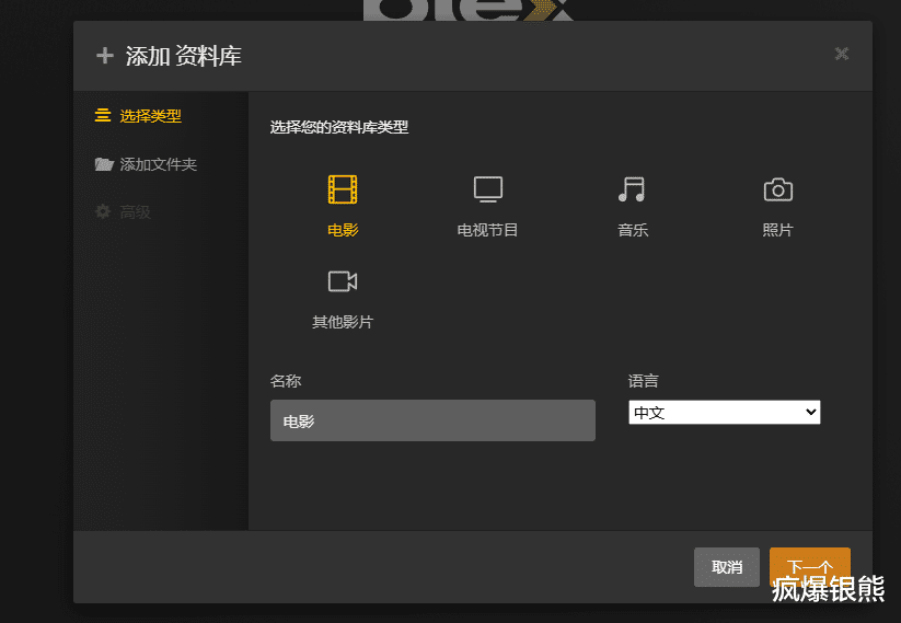 之后选择自己喜欢的类型,语言选择中文,之后跳转至文件夹,此时如果之前有往NAS中导入影片的话,那就选择相应的文件夹即可,Plex会自动扫描设置文件夹内容。