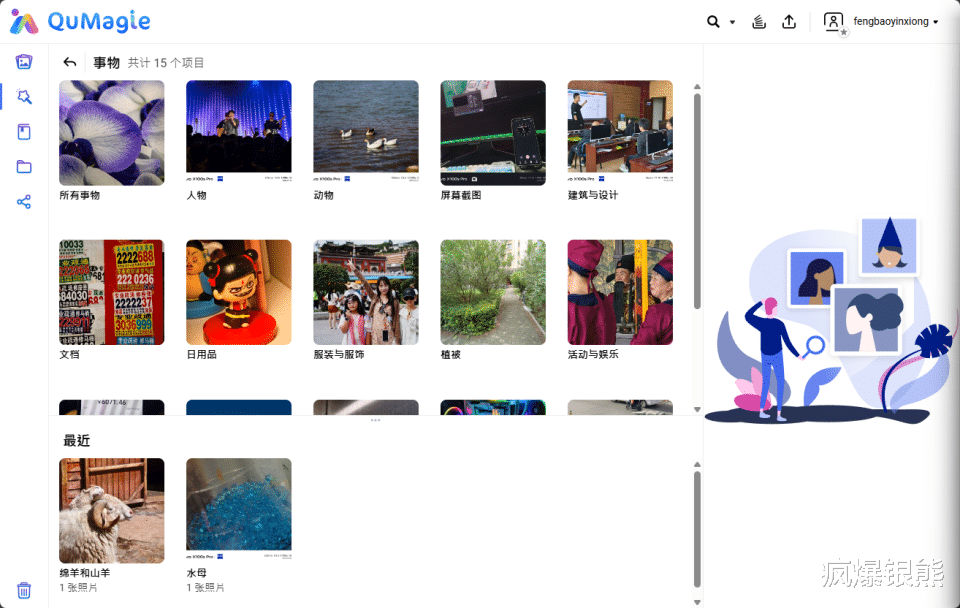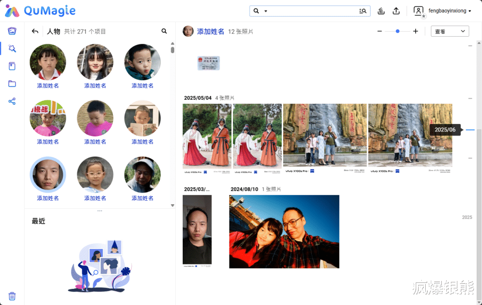 在AI引擎的加持下,QuMagie的搜索功能也更加的智能了,当我们想要搜索某张只有模糊印象的照片时,只需在搜索框中描述出照片中的场景,然后相册就能根据语义快速找到符合我们描述的图片。另外其还支持人物搜索,我们只需上传一张正在找的人物图片,然后QuMagie就会自动找出所有相关人的照片。