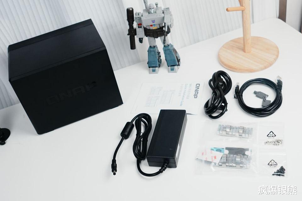 最后来个全家福,除了NAS本机外,包装箱内还有电源适配器一个,六类网线、SSD金属散热片两个、说明书、保修卡若干。其中电源适配器输出功率为12V7.5A(90W)。