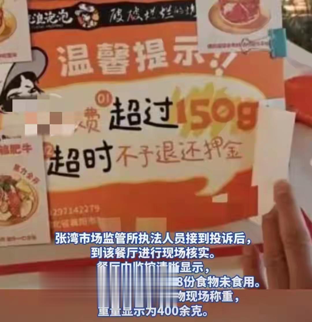 接到刘女士的投诉后,当地张湾市场监管所的执法人员很快就到店进行核查。执法人员先调了店里的监控,画面里那8份菜确实全程都没被食用。又查了餐厅的营业执照、食材检验报告,所有证件都齐全,店里也贴了醒目的节约食物提醒。工作人员还当场复称了当时的剩菜,重量确实是400多克,和餐厅记录的一模一样。