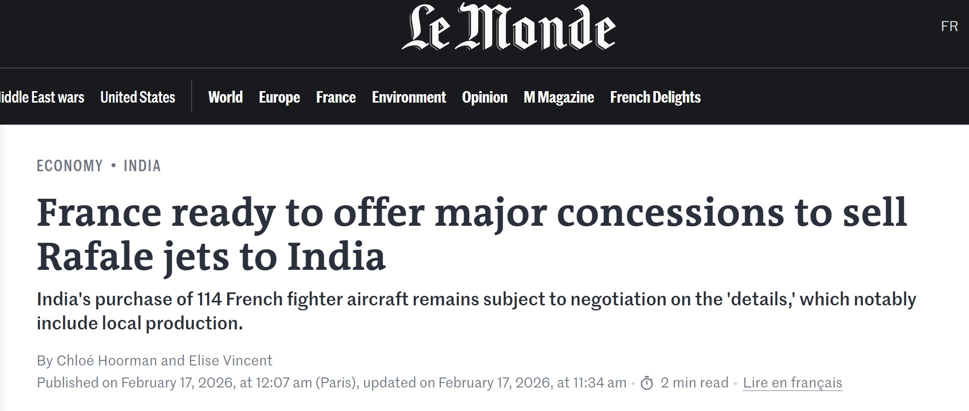 也因此,法国和印度的谈判处于“瘫痪”之中,预计需要法国、印度政府最高层出面斡旋,谈判才有可能继续推进。