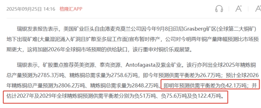 瑞银预计,2026年全球精炼铜总产量预测为2806.2万吨、2026年精炼铜总需求量为2848.2万吨,即明年预测供需平衡差为负42.1万吨,并估计2027年及2029年全球精炼铜预测供需平衡差分别为负51万吨、负75.6万吨及负122.4万吨。