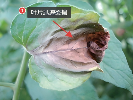 四、叶霉病典型识别特征:该病害主要为害叶片,发病初期,叶片出现不规则形褪绿黄斑或黄褐色病斑,边缘多模糊不清;随病情发展,病斑逐渐扩大并相互融合,颜色加深至深黄色至黄褐色,严重时病斑坏死,导致叶片干枯。病斑背面先生出褐色霉层,后期部分霉层会逐渐转为灰白色。当病害发生严重时,花萼也会受害,症状从尖部开始变褐,并逐步向内蔓延。