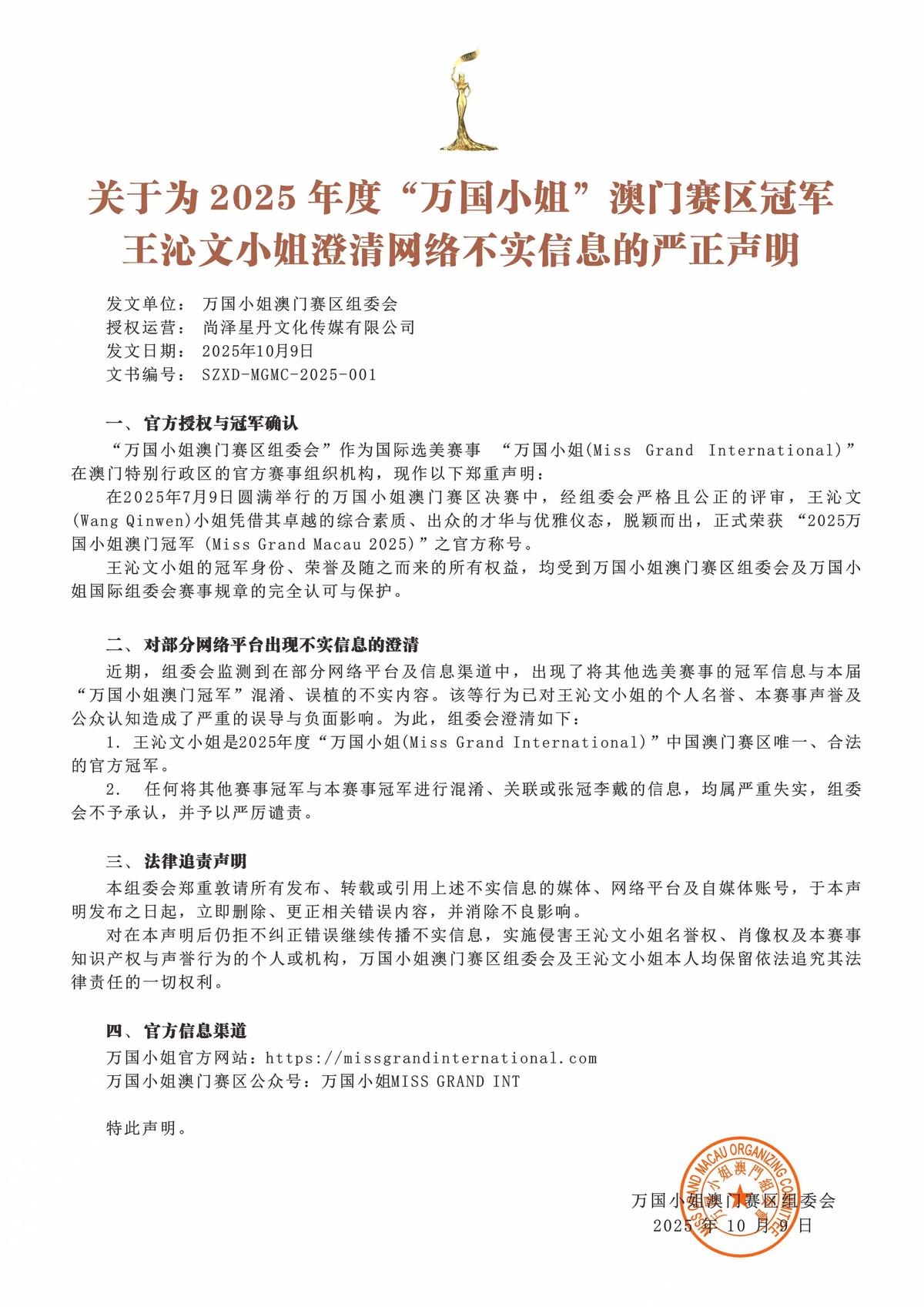 “万国小姐澳门赛区组委会”作为国际选美赛事“万国小姐(Miss Grand International)"在澳门特别行政区的官方赛事组织机构,现作以下郑重声明: