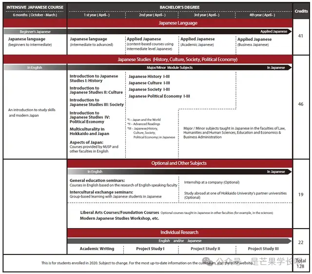现代日本研究课程(MJSP)是日本一所顶尖研究密集型大学的四年制双语日本研究学士学位课程。在该课程之前,将为日语水平不足以直接进入学士学位课程的学生开设为期六个月的日语强化课程。日语强化课程确保学生在获得本科学位时有足够的日语能力。已经拥有日语N2或以上水平的人可以申请豁免日语强化课程。他们的日语能力将在日语面试考试中进行评估。