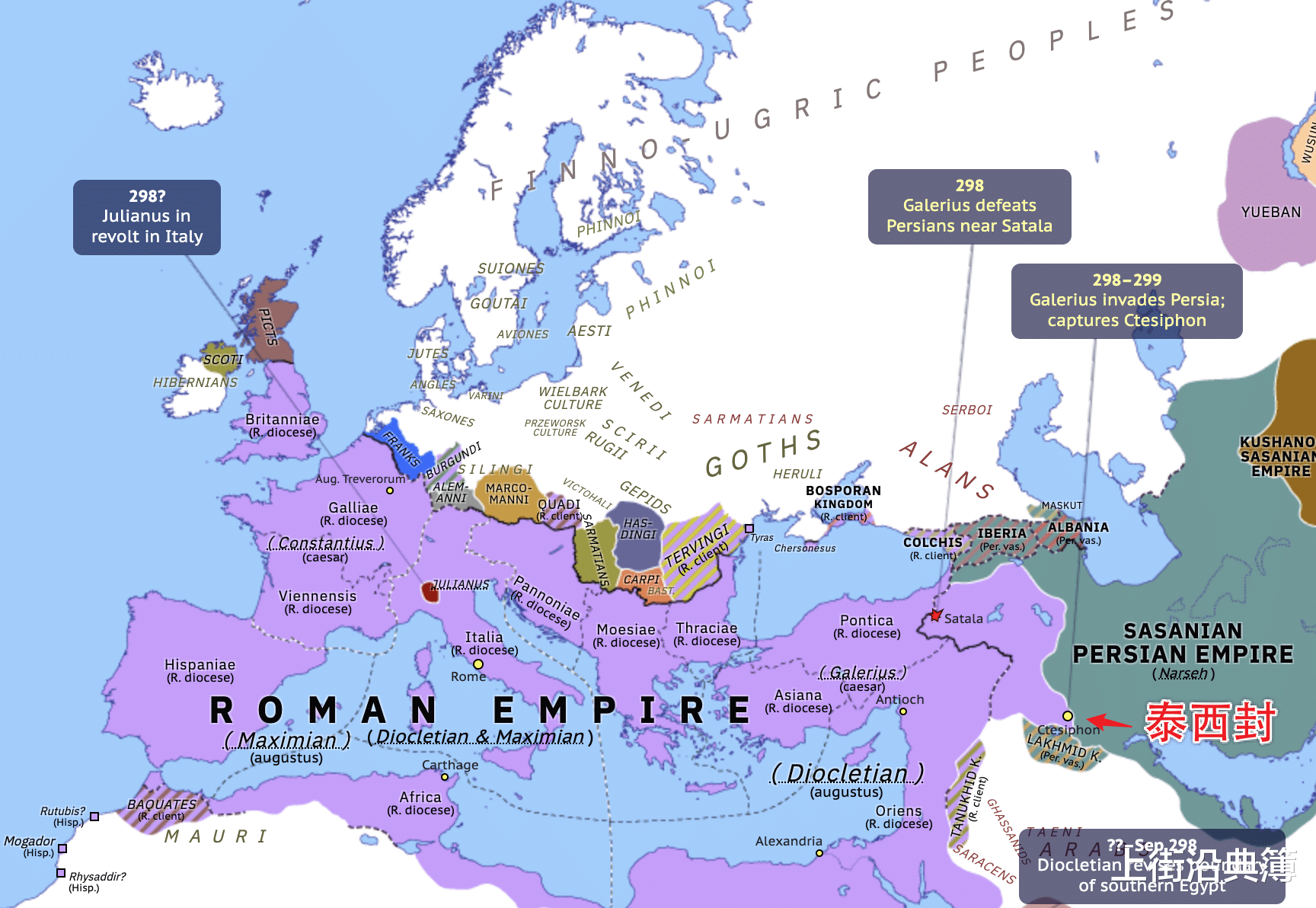 298年,此时萨珊波斯王朝已经取代了安息几十年。罗马在萨塔拉战役中击败波斯军队,随后兵逼泰西封,波斯被迫签下《尼西比斯条约》,割让幼发拉底河以东五个行省,并失去亚美尼亚战略要地,这是波斯对罗马最大的一次领土让步。不过50年后,波斯人又抢回来了。