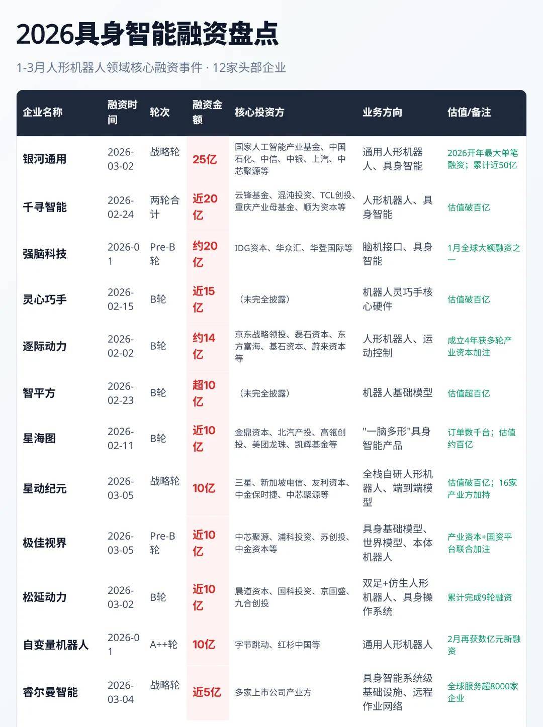 3月2日,银河通用机器人宣布完成25亿元新一轮融资,刷新了自己在2025年创下的中国具身智能单轮融资纪录。同一天,松延动力宣布B轮累计融资近10亿元。往前推一周,千寻智能拿下超20亿元,智平方完成超10亿元B轮融资,星海图完成近10亿元B轮融资。