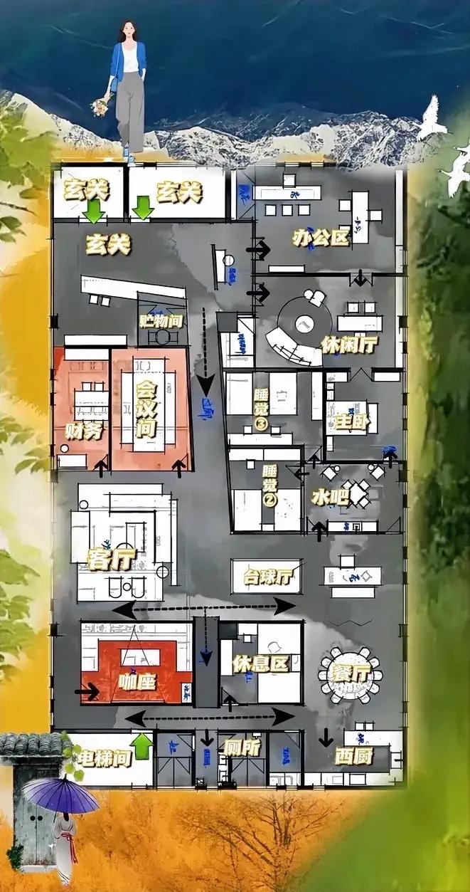 比如说,走南门,工字形动线,分隔两空间,搭配技巧,离生活区距离最近,让咖啡不晾,睡觉安静!打造两条洄动线最便捷!