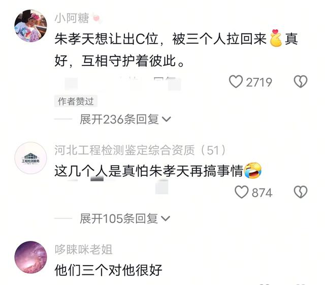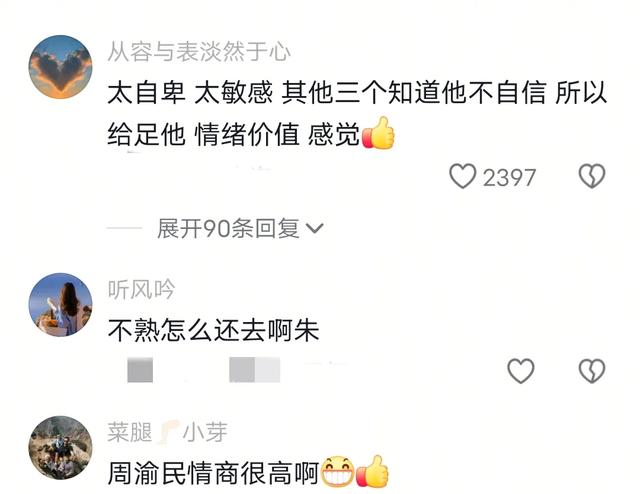 有的网友说朱比较敏感,而其三人在给他自信,给满了情绪价值。同时,他们也在互相守护着彼此,这样的举动也是大家最愿意看到的。