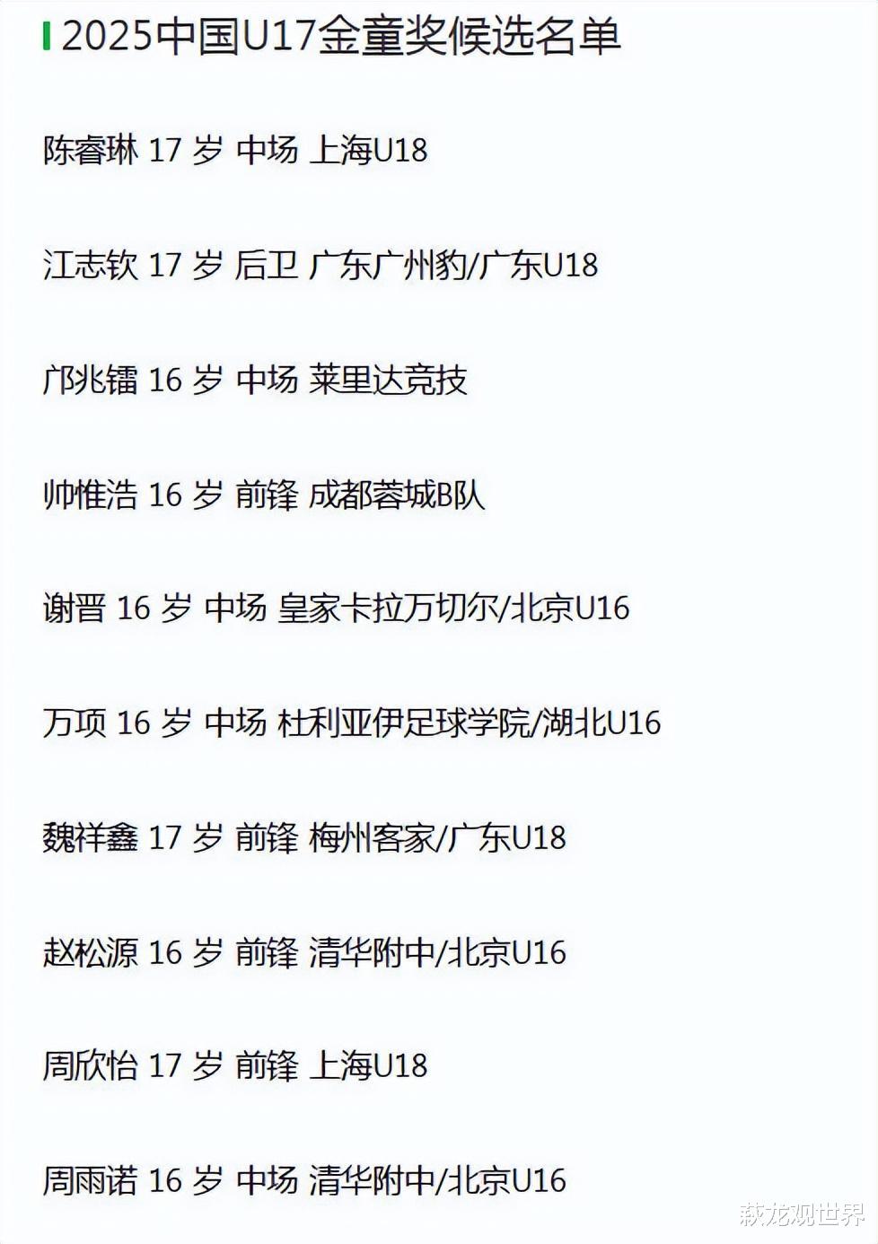 相比之下,2025中国U17金童奖竞争激烈,候选名单中有魏祥鑫、邝兆镭、万项、帅惟浩等球员,都非常优秀。其中,魏翔鑫在中超出场,还取得过进球,呼声很高。万项、邝兆镭等球员在国际赛场上也展现了出色的状态,但还打上职业联赛。就看评委更看重哪个角度了。