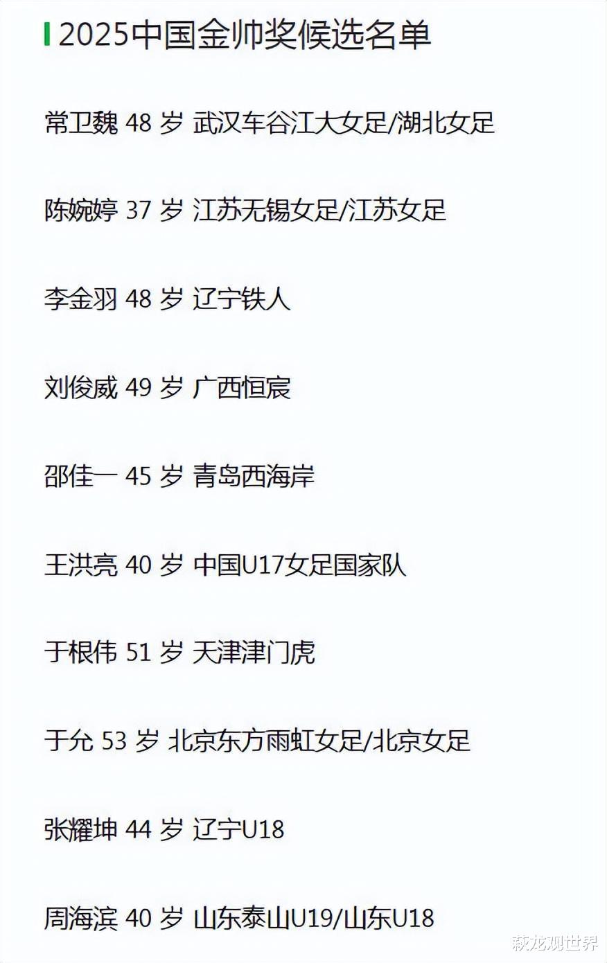 中国金帅奖,显然不带洋帅玩。这份候选名单中,有45岁青岛西海岸主教练邵佳一、51岁天津津门虎主帅于根伟、48 岁辽宁铁人主帅李金羽、40岁山东泰山U19/山东U18主帅周海滨、44 岁辽宁U18主帅张耀坤、40岁中国U17女足国家队主帅王洪亮、48岁武汉车谷江大女足/湖北女足主帅常卫魏、37岁江苏无锡女足/江苏女足主帅陈婉婷、53岁北京东方雨虹女足/北京女足主帅于允、49岁广西恒宸主帅刘俊威。