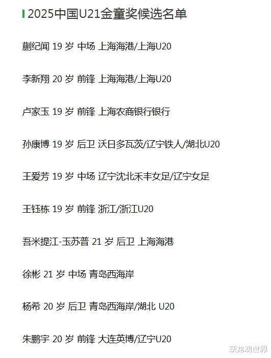 2025中国U21金童奖候选名单,由浙江本土射手王王钰栋领衔,蒯纪闻、徐彬、吾米提江、朱鹏宇、杨希等球员也入选。这基本是毫无悬念的奖项了!王钰栋的呼声最高。