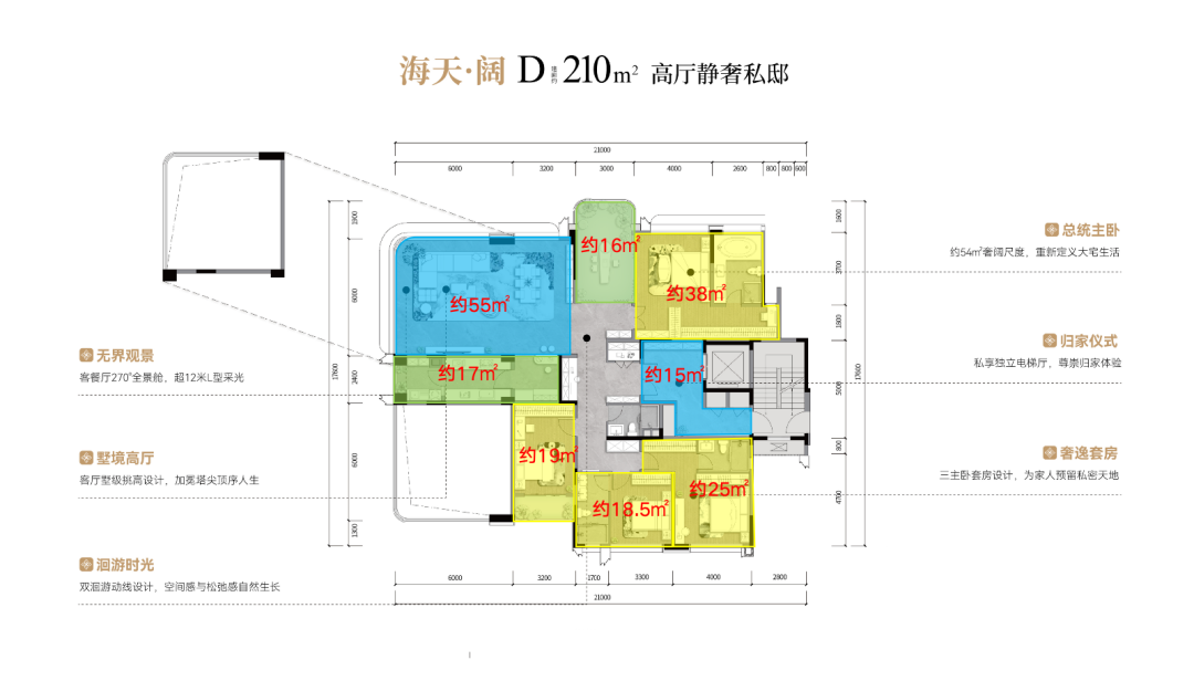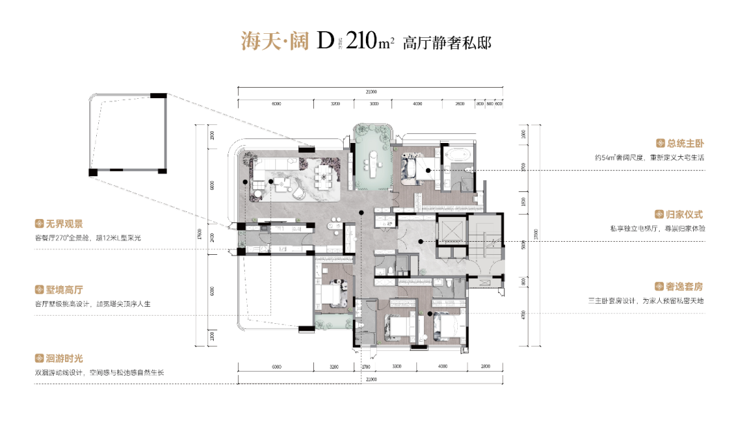 又比如建面约210㎡的户型,实现了空间尺度的全新突破。