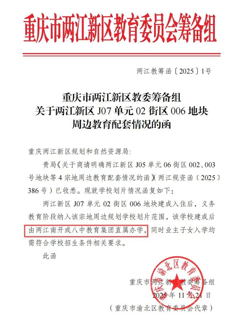 这还没完,根据官方文件显示,金开郡北侧规划了一所九年一贯制学校,将引入两江南开或八中教育集团直属办学。学校建好后,在家门口就能享受从小学到初中的一站式优质教育。