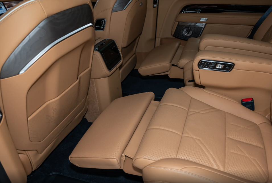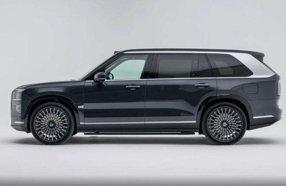 视线移动至车侧,22寸极其夸张的轮毂将车身气场提升至更高一级,车身表面没有过多装饰,只不过车身尺寸摆在那里,强大体量感扑面而来,笔直车身线条尽量避免对车内空间造成侵占。车窗周围加入银色饰板进行点缀,尤其是D柱的饰板面板更宽大,增添了一定设计感。
