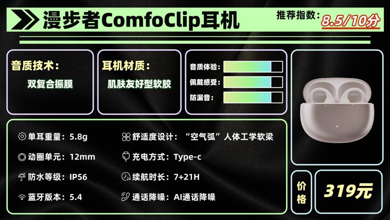 漫步者在音频领域一直有不错口碑,ComfoClip是其耳夹开放式耳机的代表作之一。这款耳机外观简洁时尚,轻便易携,佩戴感受非常舒适。耳夹部分设计相对宽松,即使长时间佩戴也不会有明显压迫感,非常适合日常听歌、通勤或轻运动使用。同时,它延续了开放式设计特点,可以感知外界环境声,对于希望随时关注周围情况的人来说很方便。