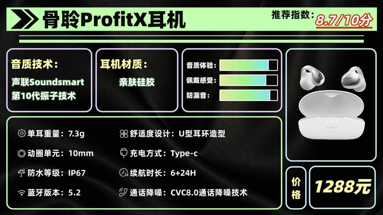 音质方面,ProfitX偏向轻盈自然的风格。低频表现适中,中高频清晰,但整体音色温和,不会震耳也不刺耳,非常适合日常通勤、散步或运动使用。如果追求重低音或希望音色层次丰富,这款可能略显保守。总体来说,音色舒适,长时间听也不容易疲劳。