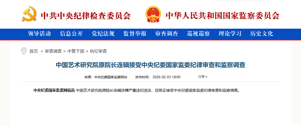 中央纪委国家监委网站讯中国艺术研究院原院长连辑涉嫌严重违纪违法,目前正接受中央纪委国家监委纪律审查和监察调查。