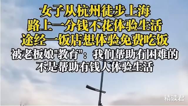 前几天看到一条视频,一位女子计划从杭州徒步到上海,一路上的吃饭住宿都不打算花一分钱,美其名曰“体验生活”。