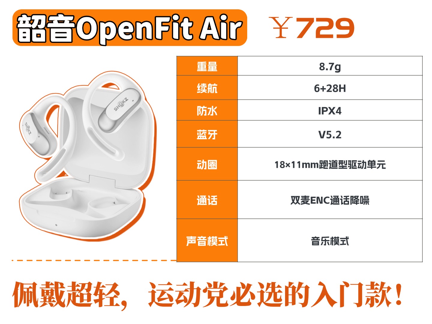 韶音 OpenFit Air(729 元):均衡实用的百搭款,音质的氛围感和立体环绕感出色,佩戴稳固性适合运动场景,各方面功能都能达到日常使用的及格线,没有明显的短板,适合对耳机没有特殊功能要求,想找一款能应对日常通勤、轻度运动等多种场景的百搭机型。