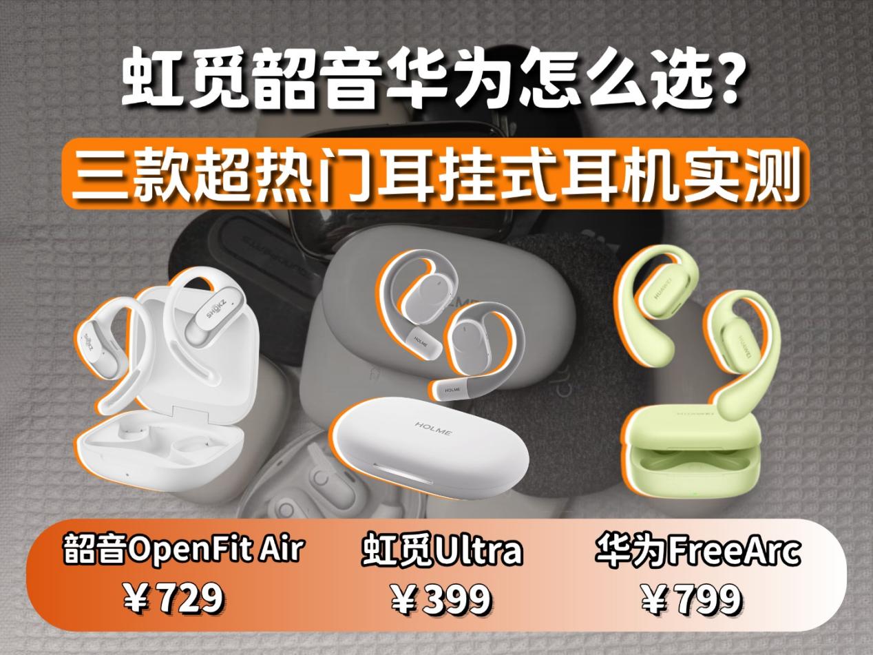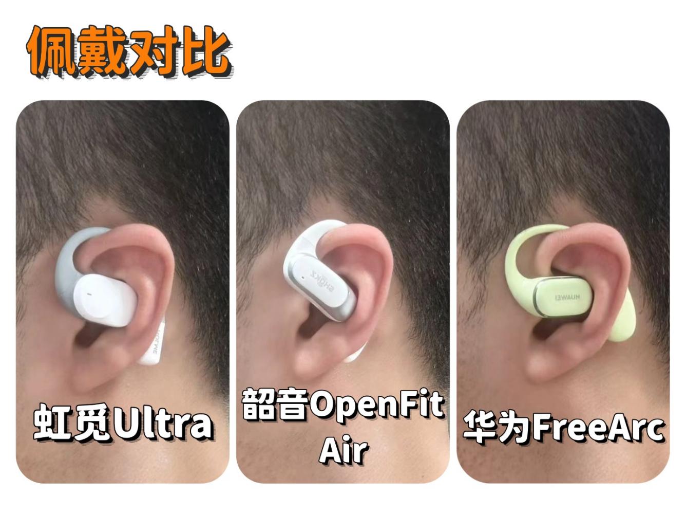 我前后试过不少开放式挂耳耳机,踩过不少只看宣传入手的坑,最后筛选下来,有三款是真正贴合日常使用、各有特色的,分别是 399 元的虹觅 Ultra、729 元的韶音 OpenFit Air 和 799 元的华为 FreeArc。这三款耳机定位不同、价位有差,在外观、音质、佩戴感等方面的表现也各有优劣。接下来我就从普通用户的实际使用角度,把这三款耳机的各项表现详细对比一番,给想入手开放式挂耳耳机的朋友一个实在的参考,让大家能根据自己的需求和预算,选到最适合自己的那一款。