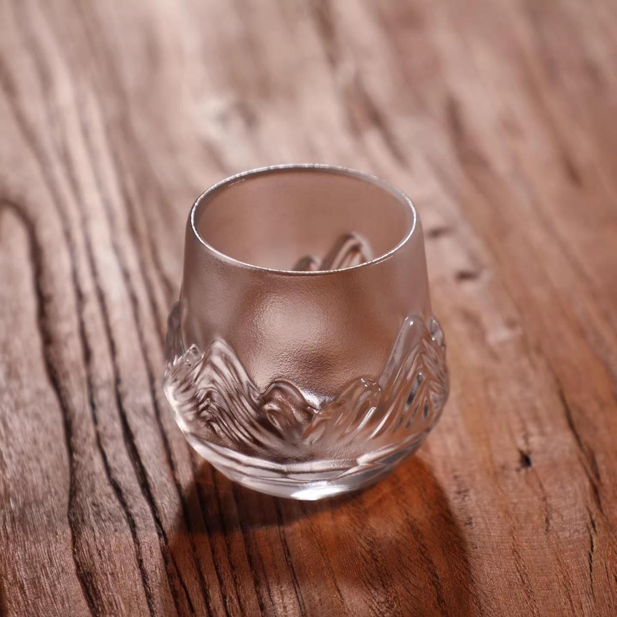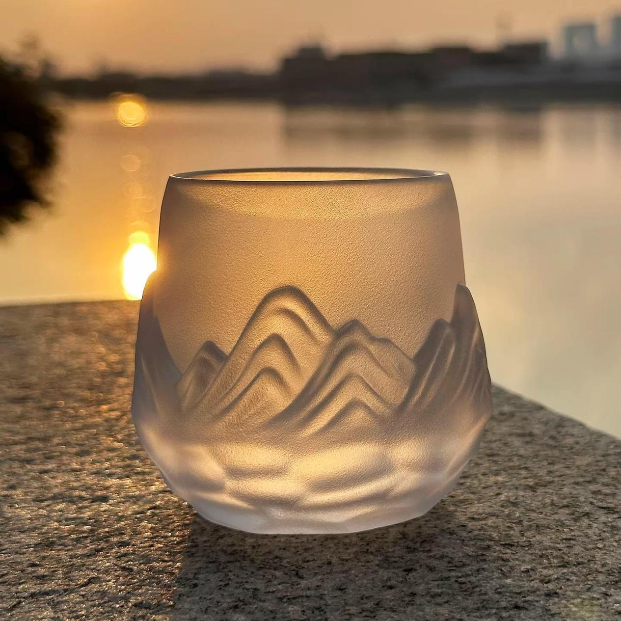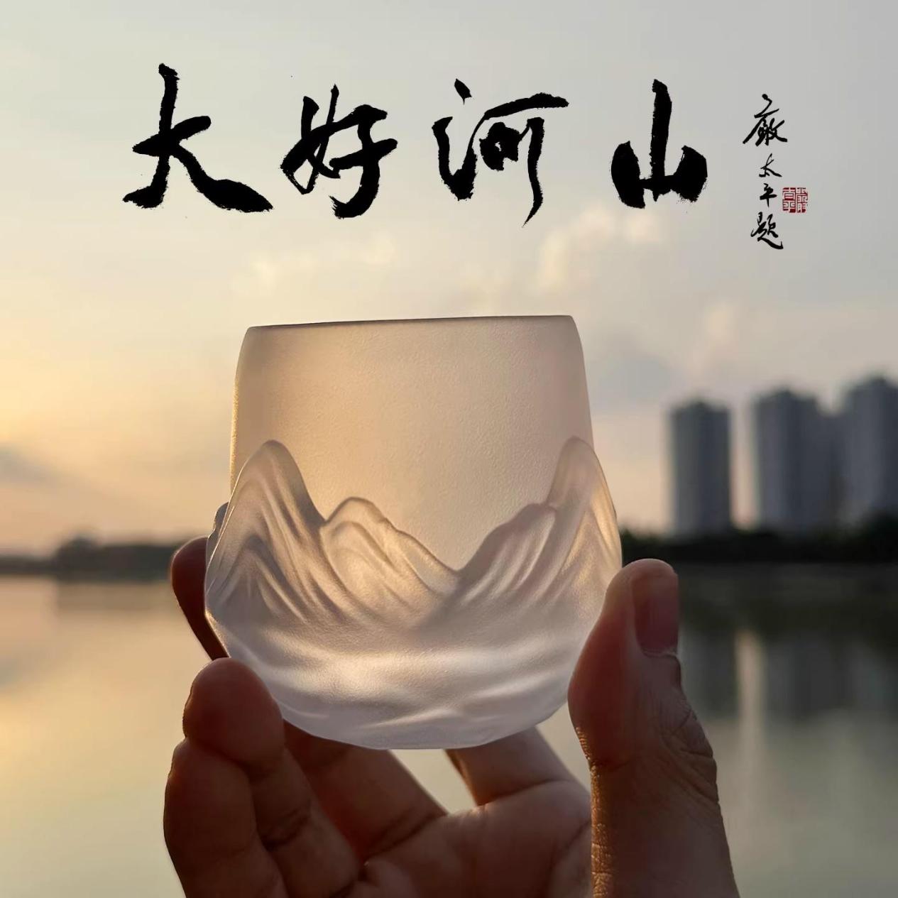 而最让人拍案叫绝的,是其将山河主题与杯子设计的完美融合。杯身上的山峦起伏,巧妙地对应着杯身的弧度,仿佛是山脉自然地延伸在杯壁之上;蜿蜒的溪流则顺着杯身的曲线流淌,仿佛真的有水在杯中流动。当杯中倒入茶汤,那澄澈的液体与琉璃材质相互映衬,更像是山间的清泉,为这大好河山增添了几分灵动与生机。每一次端起杯子,都像是置身于山水之间,在忙碌的生活中寻得片刻宁静,实用性与艺术性在这小小的杯子上得到了和谐统一。