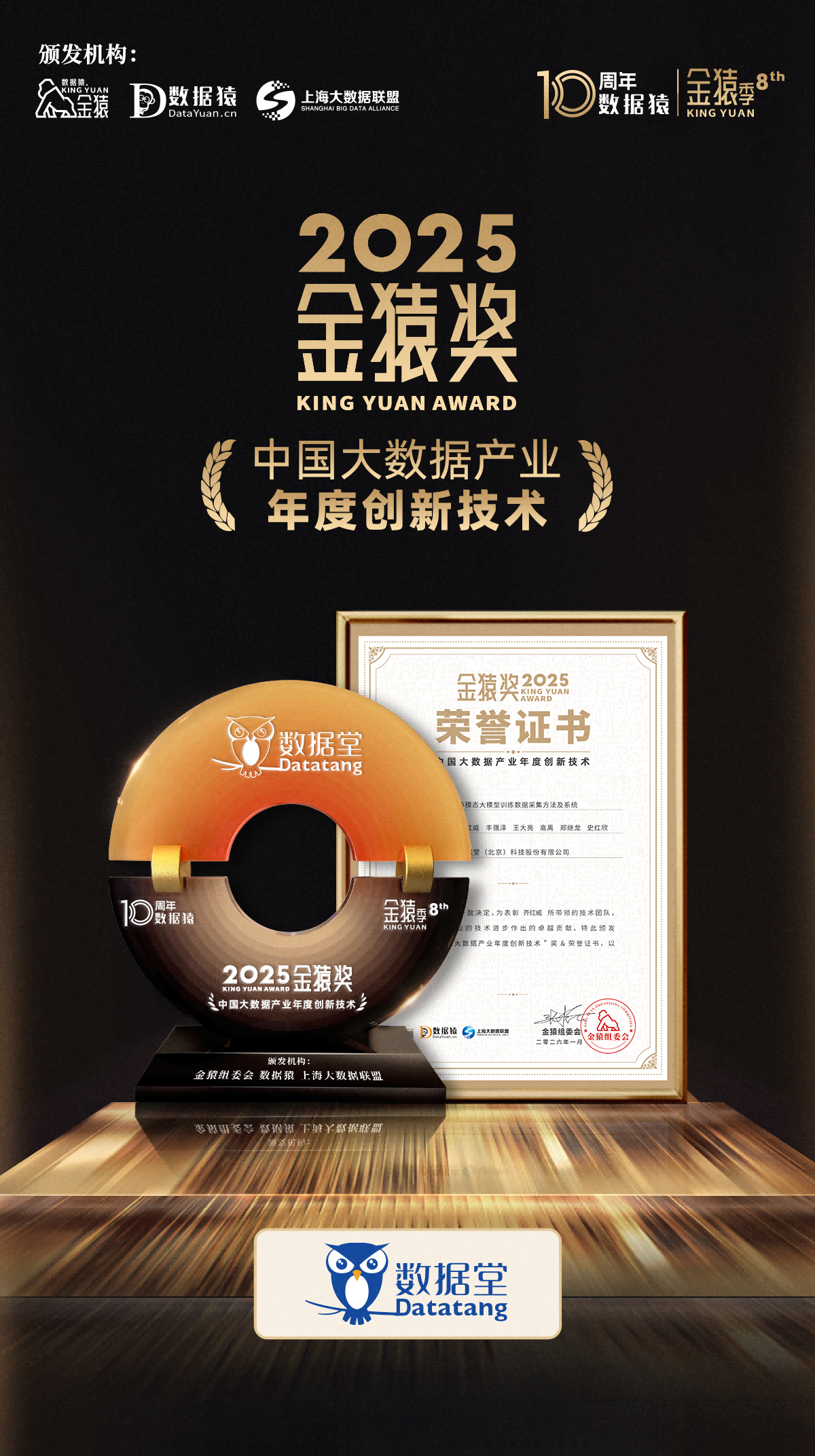 近日,由上海市数据局作为指导单位,金猿组委会、数据猿、上海市数商协会及上海大数据联盟联合主办的“2025第八届金猿大数据产业发展论坛——暨AI Infra & Data Agent趋势论坛”在上海成功举办。论坛现场揭晓了年度八大奖项,数据堂凭借其先进技术实力,成功斩获“2025中国大数据产业年度创新技术”奖。