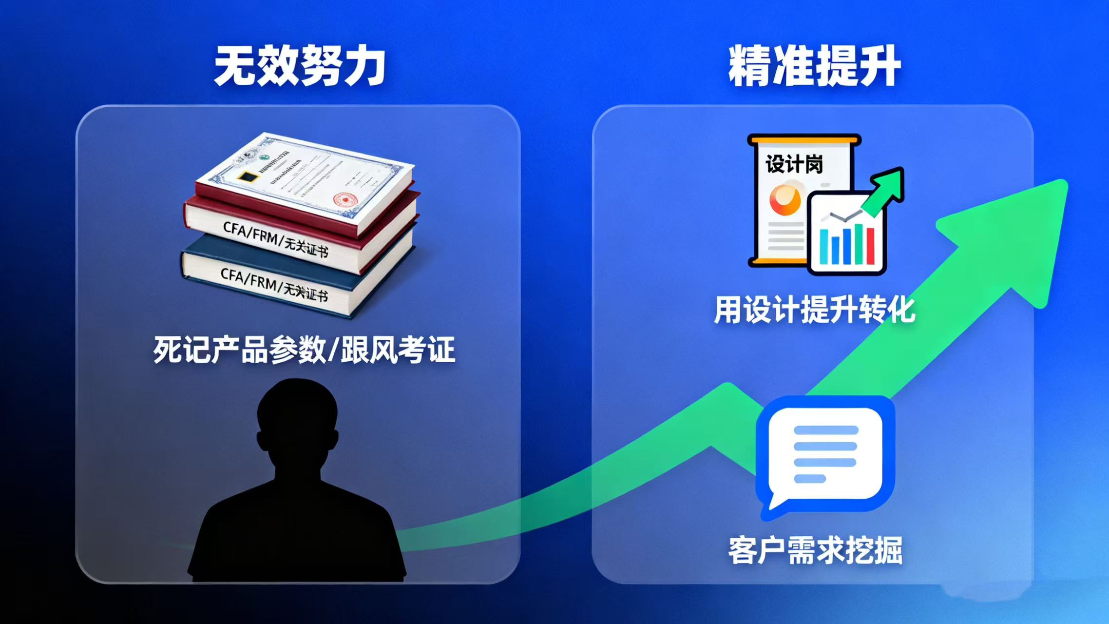 前同事小王曾跟风报考 CFA、FRM 证书,每天学到凌晨 1 点,工作却频频出错 —— 他是做金融产品销售的,那些复杂的金融模型知识,和客户沟通时几乎用不上,反而因为精力分散,连基础的客户需求挖掘都做不好,季度业绩排名垫底。
