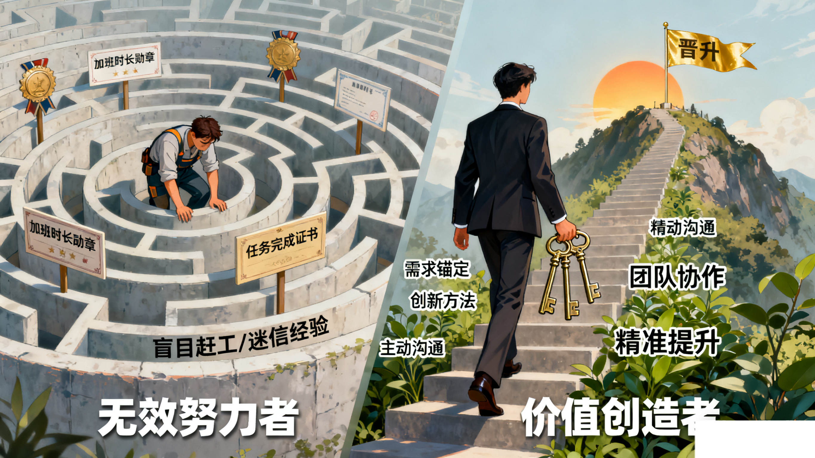 打开绩效表的那一刻,我盯着 “中游” 的评级愣了半天 —— 作为互联网公司的设计师,我上周刚改完第 17 版 Banner 图,连续三个月加班到十点,可晋升名单里还是没有我的名字。直到领导甩来一组数据:“你做的活动海报转化率比去年低 15%,改了 3 版的按钮点击量没变化。职场拼的不是苦劳,是价值。” 这句话点醒了我,也揭开了无数人 “努力却不升职” 的真相:你以为的勤奋,可能只是无效努力的陷阱。今天拆解 5 个最致命的坑,30 岁前避开,下次晋升名单里大概率有你。