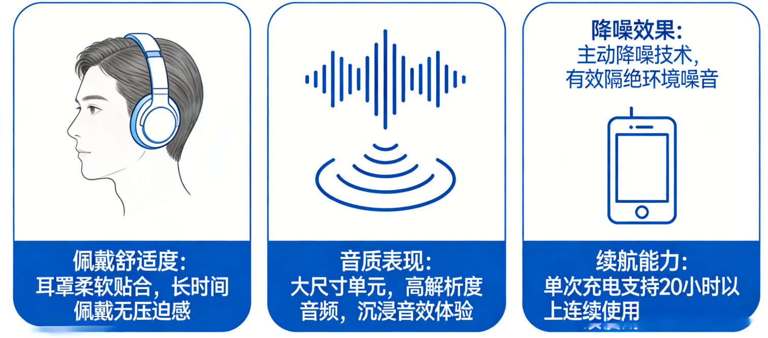 核心优点就3个:一是佩戴舒适,包裹式耳罩不压耳道,长时间戴(通勤1-2小时、办公一下午)也不会累,尤其适合戴眼镜的朋友。